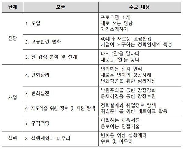 이에 따라, 이 프로그램은 40대 구직자들의 특성을 고려해 성공적 직업전환에 대한 이론모형을 근거로 진단-개입-실행의 3단계 8개 모듈로 구성해 맞춤형 취업을 지원한다.