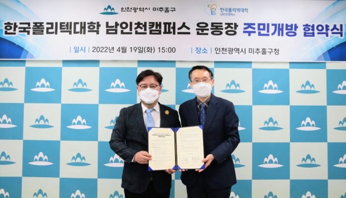 인천 미추홀구(구청장 김정식)와 한국폴리텍대학 남인천캠퍼스는 19일 한국폴리텍대학 남인천캠퍼스 운동장 주민개방 협약을 체결했다.