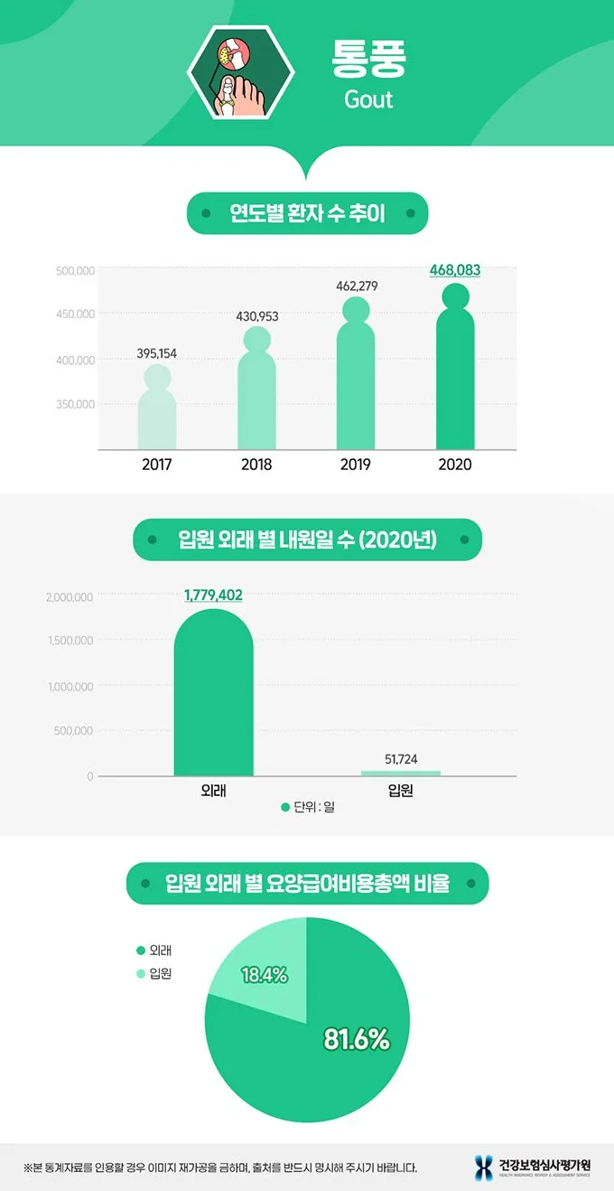 [시니어신문=김형석 기자] 예전에는 ‘통풍’이 기름진 음식을 많이 먹는 왕과 귀족에게 잘 생긴다고 하여 ‘왕의 병’이라고 불렸지만, 지금은 식습관이 바뀌면서 흔하게 발생하는 질환이 되었습니다. 매년 꾸준히 증가세를 보이고 있는 통풍에 대해서 알아봅니다.