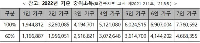 가구원의 상시근로소득, 기타사업소득, 임대·이자소득 등 재산소득 및 공적이전소득을 합산하고, 근로·사업소득을 공제(30%)하여 가구의 소득을 산정합니다.