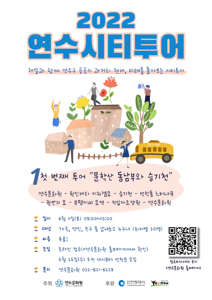 ○ 첫 투어 일정에 참여를 원하는 시민은 5월 25일(수) 오전 10시부터 연수문화원 홈페이지(www.yeonsu.or.kr)에서 온라인으로 접수하거나 연수문화원(청학동 청학문화센터 2층)에 방문하여 접수할 수 있다.
