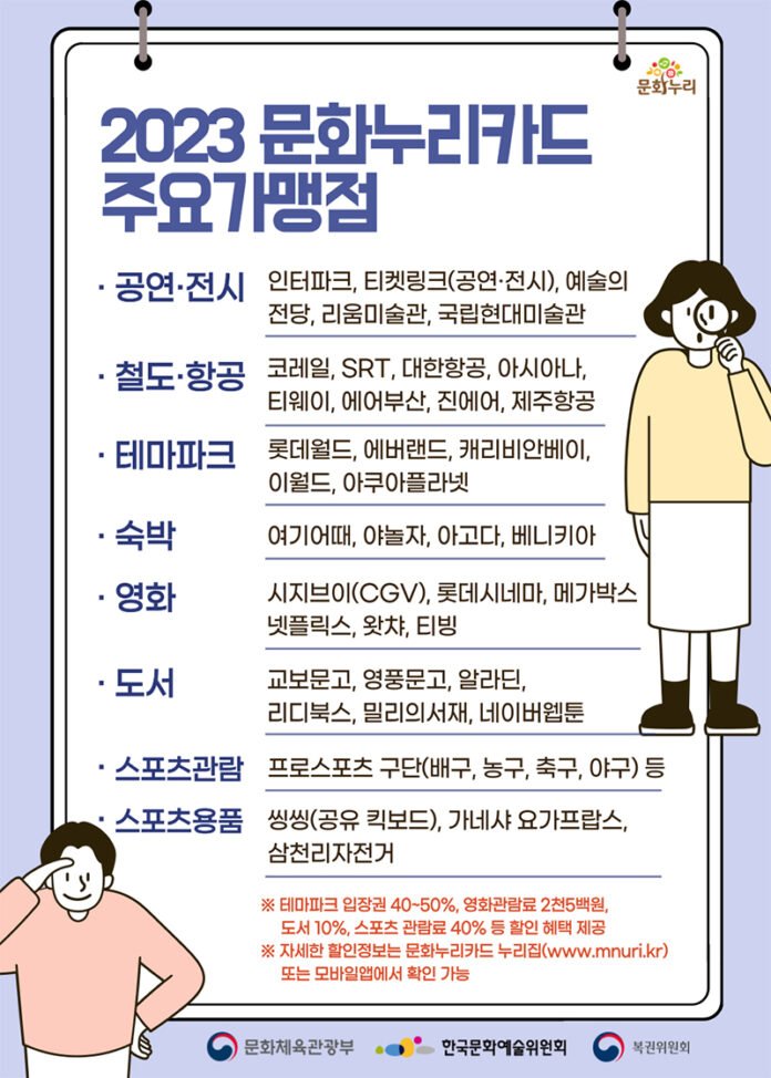 [시니어신문=임영근 기자] 문화체육관광부는 사회적 약자인 취약계층의 문화 누림 기회를 증진하기 위해 올해 문화누리카드 지원 인원을 263만 명에서 267만 명으로 4만 명 확대한다고 31일 밝혔다.