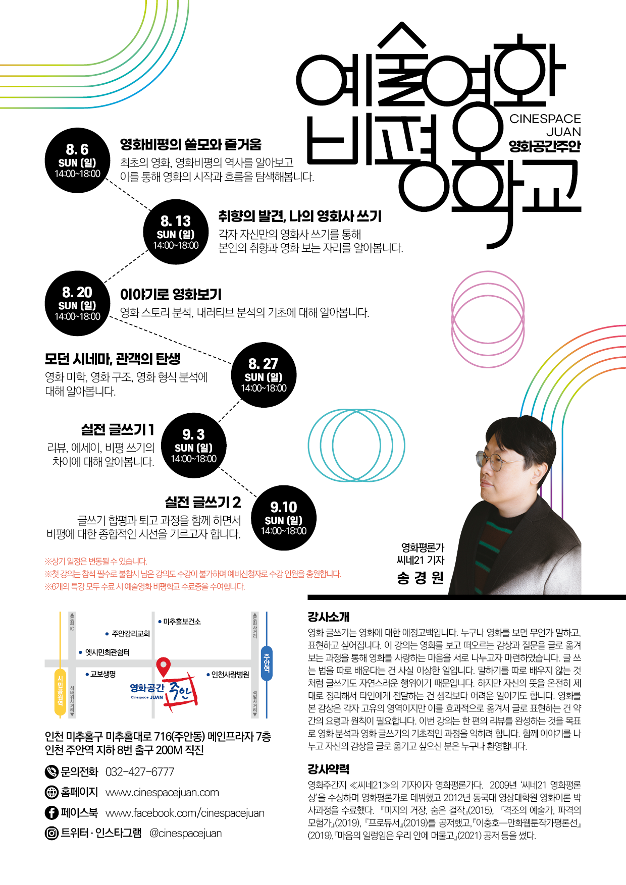 □ 2023년 영화공간주안 예술영화 비평학교는 8월 6일(일)부터 9월 10일(일)까지 매주 일요일 총 6회에 걸쳐 진행될 예정이다. 강사로는 씨네21의 기자이자 영화평론가인 송경원이 함께한다. 강의 시간은 오후 2시부터 6시까지 4시간이다.