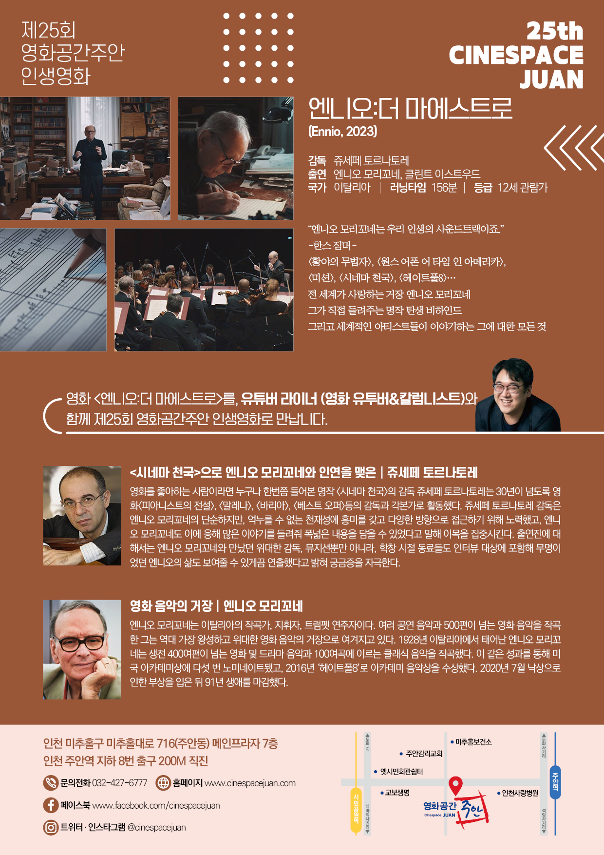 □ 제25회 영화공간주안 인생영화 <엔니오:더 마에스트로>는 8월 26일(토), 오후 2시 영화 유튜버이자 칼럼니스트인 라이너가 진행한다. 정시 상영 후 관객과의 대화를 진행할 예정으로 관람료는 8,000원이다.