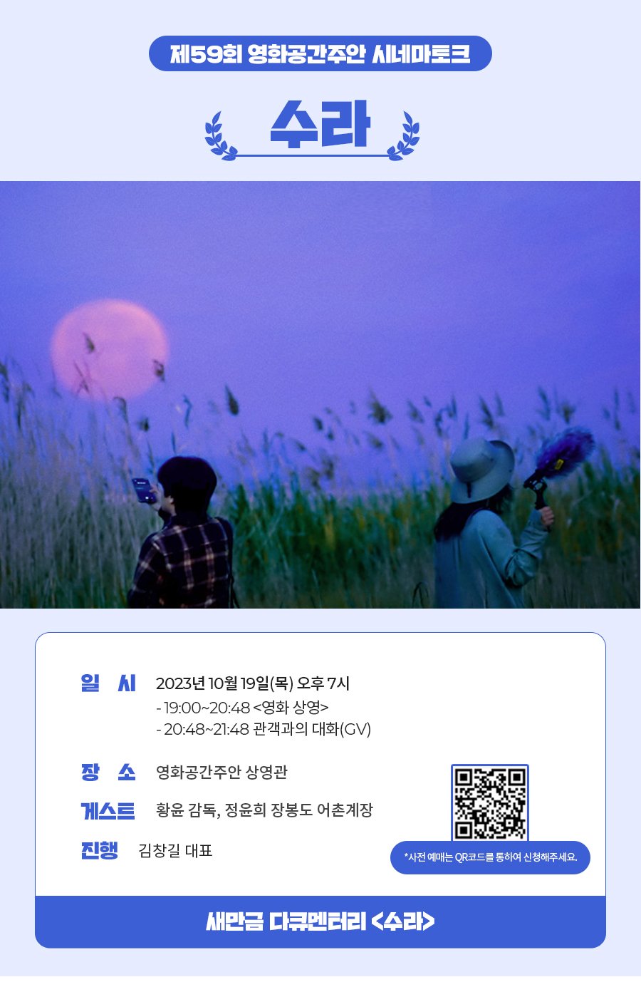 □ 10월 19일(목) 오후 7시에 진행될 시네마토크에는 황윤 감독과 정윤희 장봉도 어촌 계장, 진행자로는 김창길 민예총 정책위원장이 함께 할 예정이며, 예매는 QR코드를 통하여 사전에 신청하면 된다.