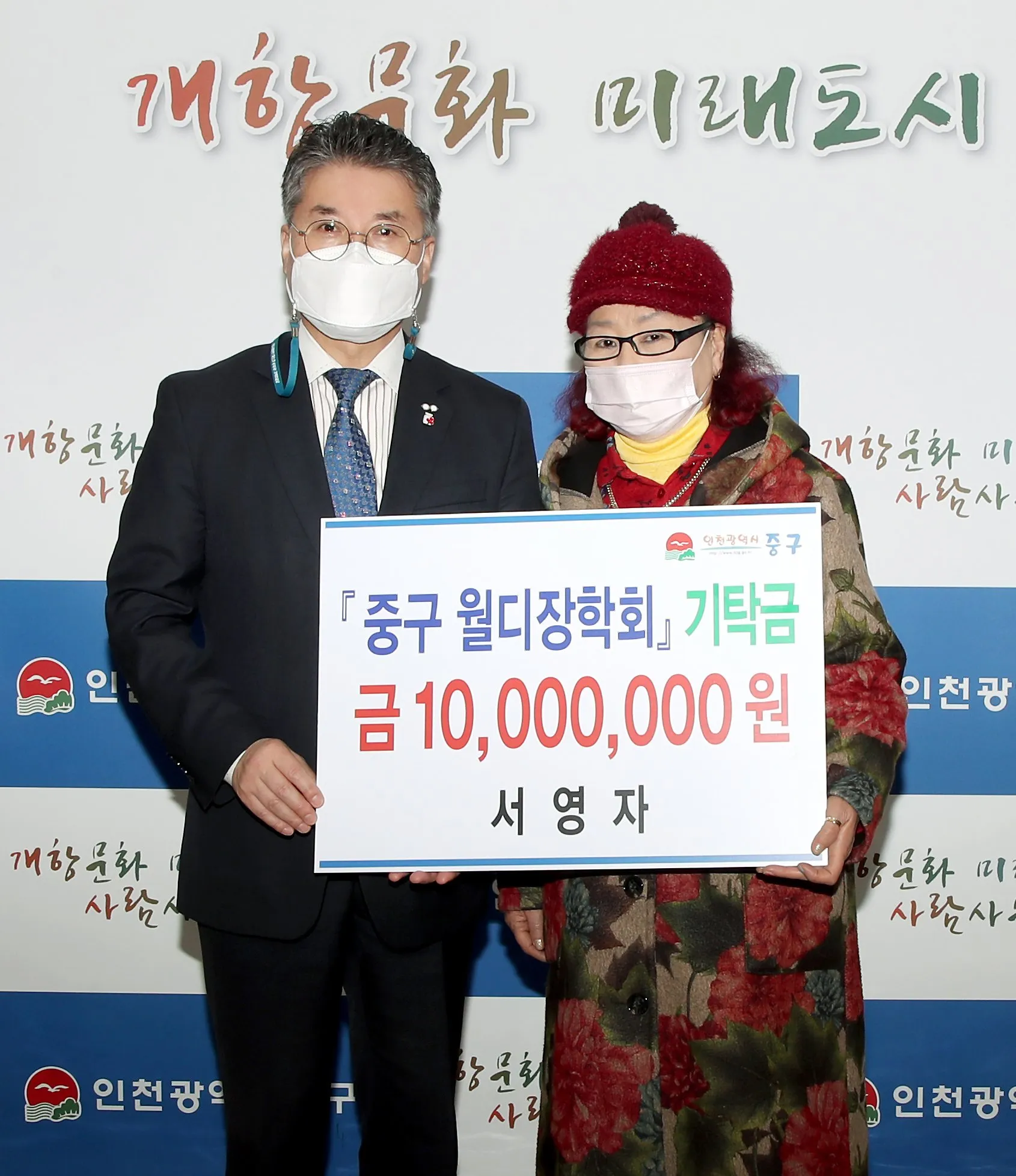 인천 중구 월디장학회(구청장, 홍인성)는 지난 26일 서영자님께서 중구청을 방문하여 1,000만원을 쾌척하여 추운겨울 이웃사랑 실천을 하시는 훈훈한 미담을 알렸다.