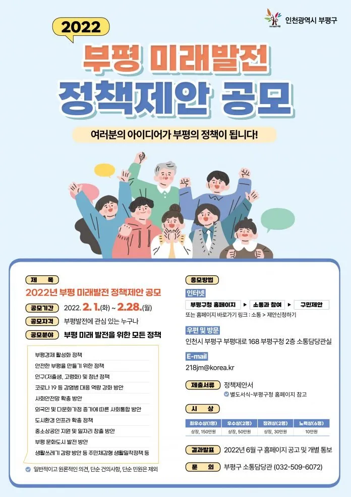 부평구가 2월 1일부터 28일까지 구민들의 의견을 수렴해 부평의 미래발전 정책을 수립하는 2022년도 ‘부평 미래발전 정책제안 공모’를 진행한다.