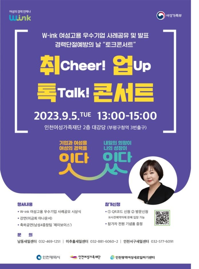 인천광역새일센터는 9월 5일 오후 1시부터 3시까지 인천여성가족재단 2층 대강당에서 인천지역 기업과 여성 구직자·재직자를 대상으로 ‘2023 취업톡콘서트(Cheer Up Talk)’를 개최한다.