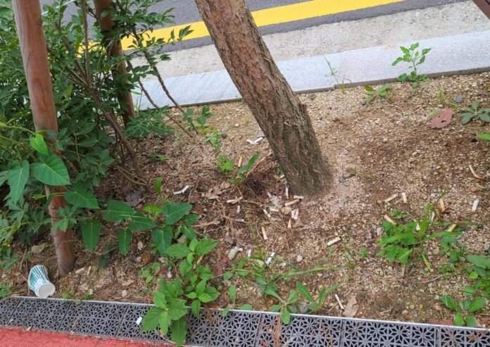 이곳 도로를 따라 가로수 화단에는 주민들이 버린 담배꽁초와 쓰레기가 가득했다. 버스정류장 주변에선 사람들이 담배를 꺼내 피우는 모습이 쉽게 눈에 띈다.