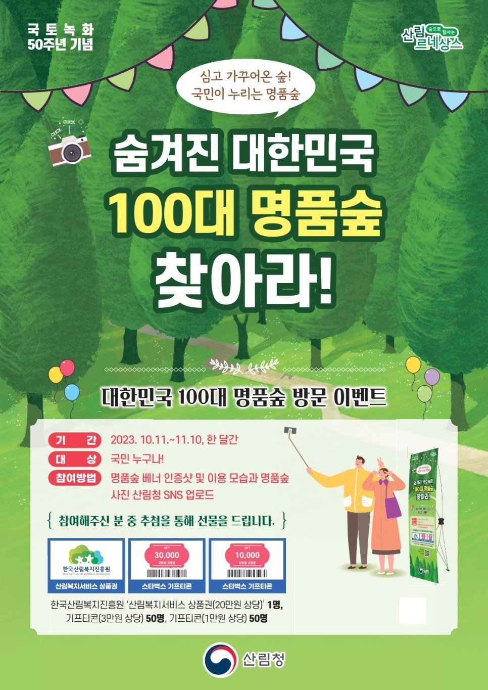 산림청은 이달 11일부터 11월 10일까지 100대 명품숲을 선정하고, 이곳을 찾는 방문객을 대상으로 산림복지 서비스 상품권과 기프티콘을 제공한다.