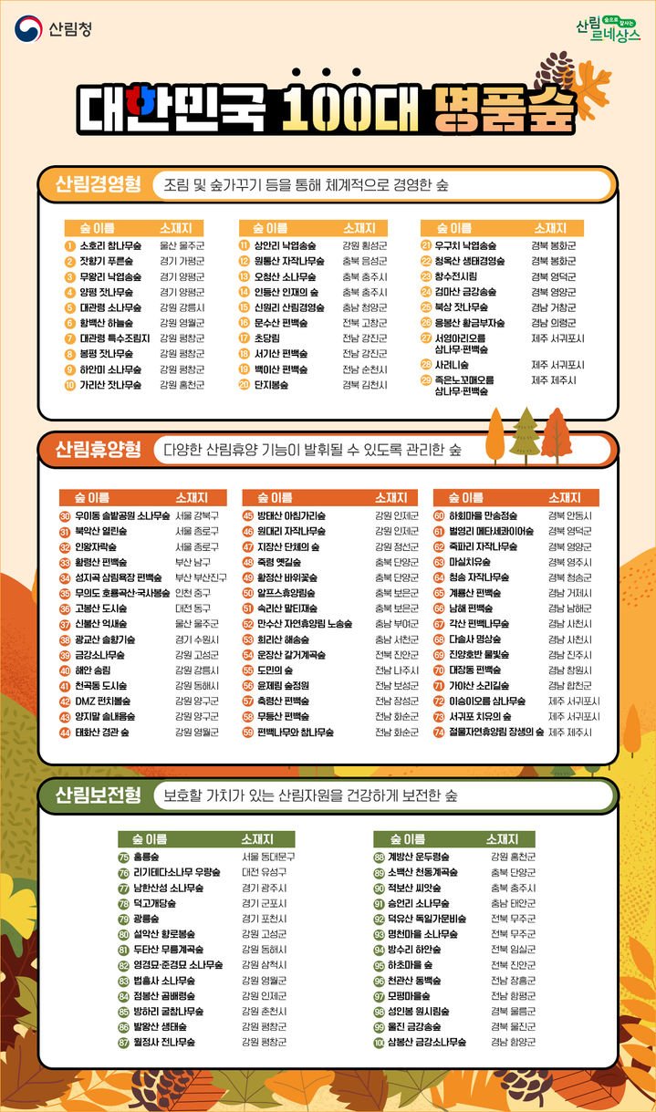 산림청은 이달 11일부터 11월 10일까지 100대 명품숲을 선정하고, 이곳을 찾는 방문객을 대상으로 산림복지 서비스 상품권과 기프티콘을 제공한다.