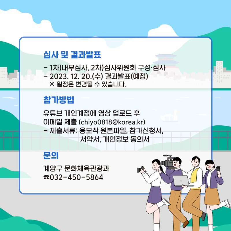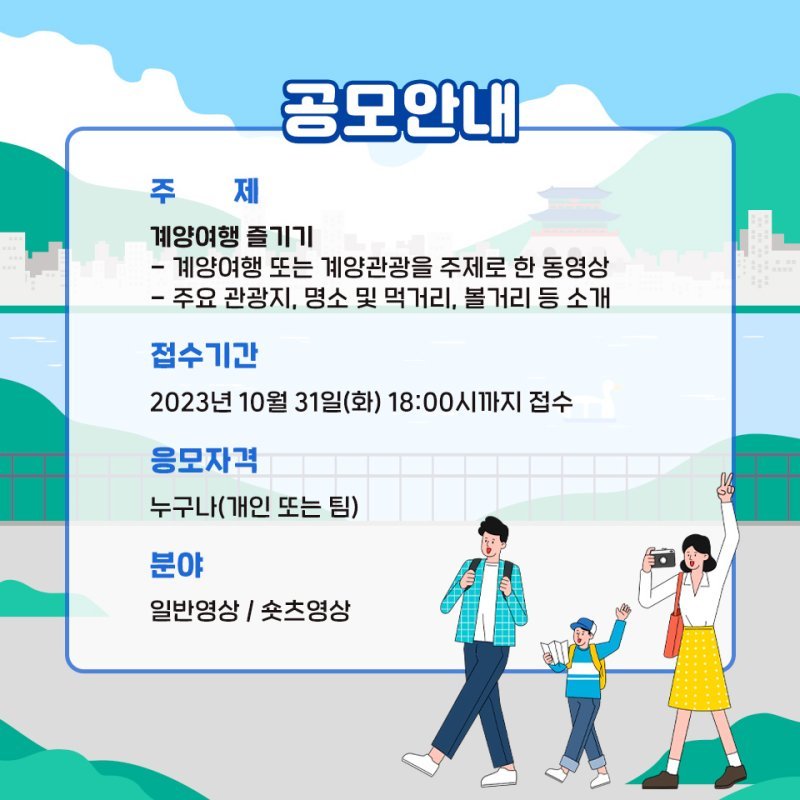 주제는 계양여행 또는 계양관광을 주제로 한 동영상이나 주요 관광지, 명소 및 먹거리, 볼거리 등을 소개하는 일반영상, 숏츠영상이다. 상금은 일반영상 대상 200만원, 숏츠영상 대상 100만원 등이다.
