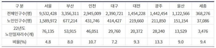 – 올해 인천시 노인일자리 제공율 10.7%, 7개 특·광역시 중 2위 –