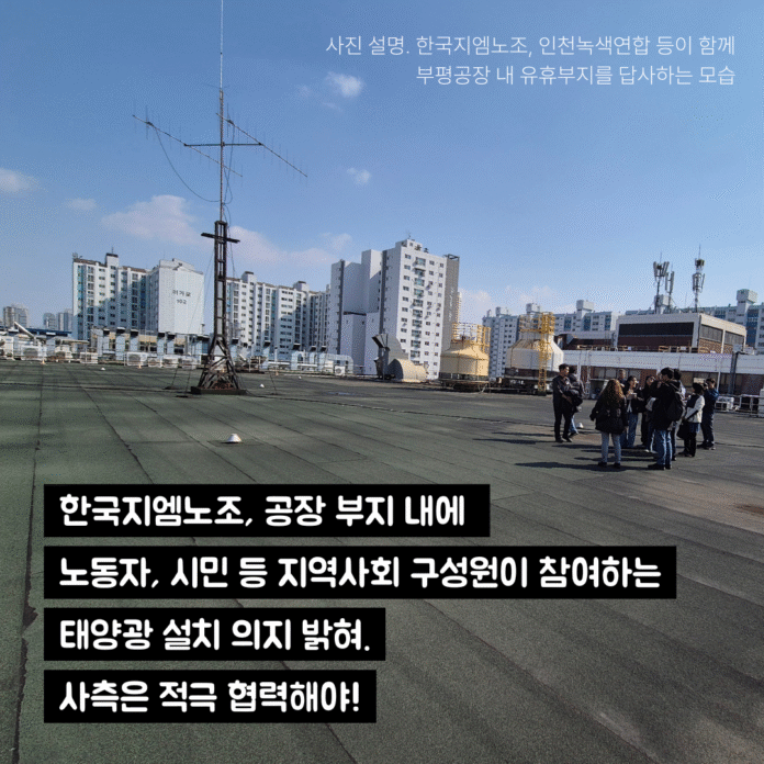 인천녹색엽합과 한국지엠노조는 지난 3월 6일(목), 부평공장 내 태양광 설치 가능 부지를 살펴보는 현장 시찰과 간담회를 통해 환경단체, 노조, 지자체, 지역 주민이 협력하는 산업단지 공공 재생에너지 모델을 만드는데 적극 협력하기로 했다.