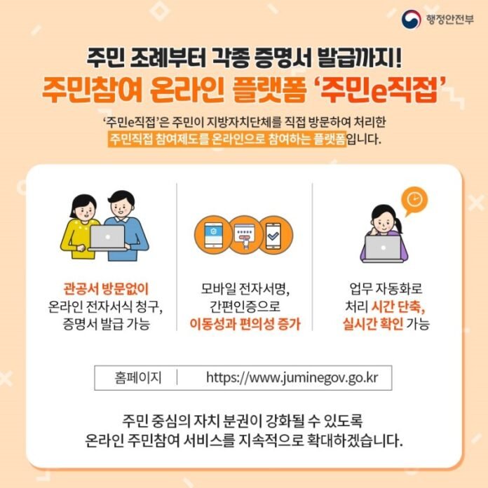 행정안전부와 17개 시·도는 이와 같은 내용을 처리할 수 있는 주민참여 온라인플랫폼 ‘주민e직접’을 공동으로 구축해 8일부터 서비스를 개시한다고 밝혔다.