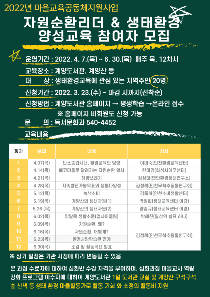 인천광역시교육청계양도서관(관장 김호섭)은 마을교육공동체 사업인 2022년 자원순환 리더 & 생태환경 양성 교육을 4월 7일(목)부터 6월 30일(목)까지 운영한다.