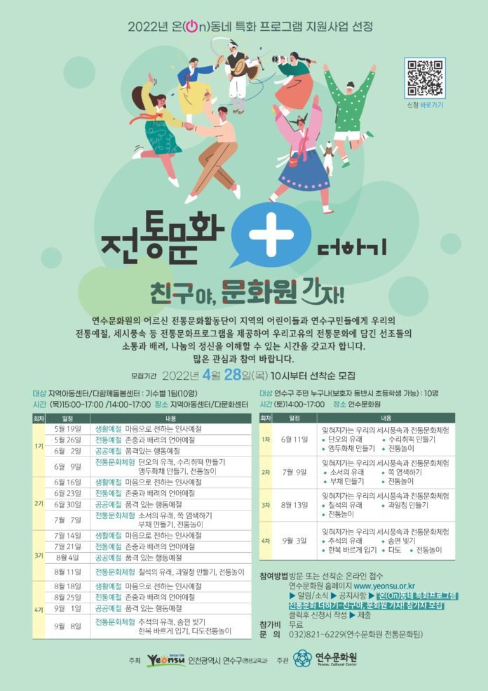 ○ <전통문화 더하기-친구야, 문화원 가자>는 연수구가 주최하는 ‘2022년 온(on)동네 특화 프로그램’에 선정되어 연수문화원이 주관하는 전통문화 프로그램이다.