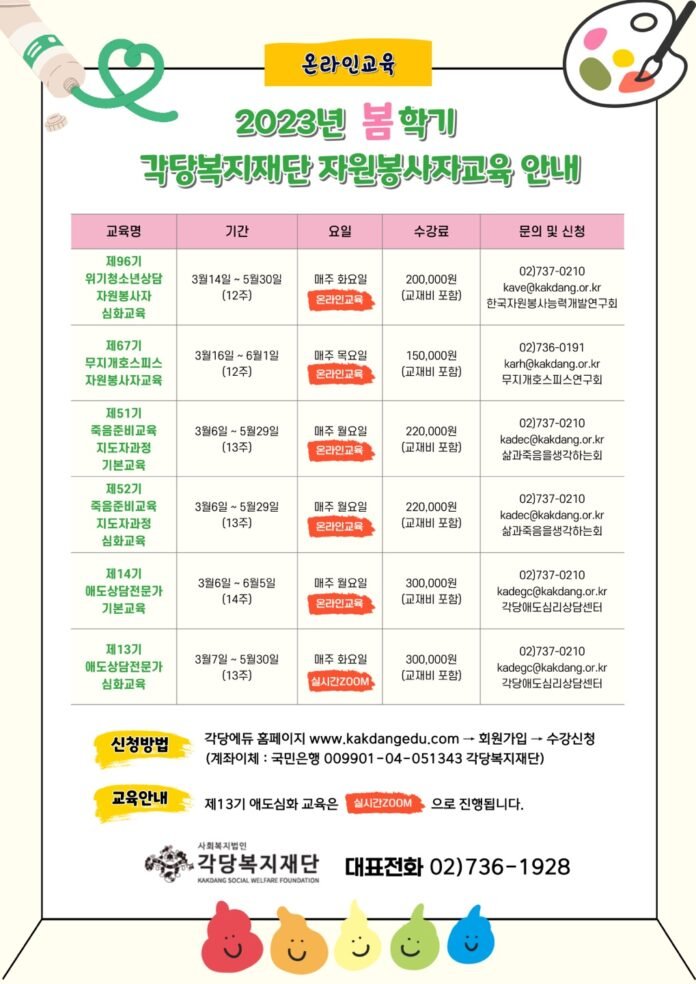 각당복지재단은 7일 각당에듀 홈페이지(kakdangedu.com/course/)에서 ▲위기청소년상담 ▲호스피스 전문봉사자과정 ▲죽음준비교육 지도자과정 ▲애도상담 전문가과정 등 2023년 봄학기 교육생을 모집한다고 밝혔다.