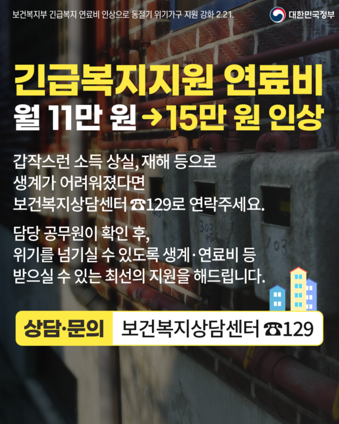 보건복지부는 21일 난방비 상승으로 어려움을 겪는 위기가구 지원을 위해 긴급복지지원 연료비를 22일부터 월 11만 원에서 15만 원으로 인상한다고 밝혔다.