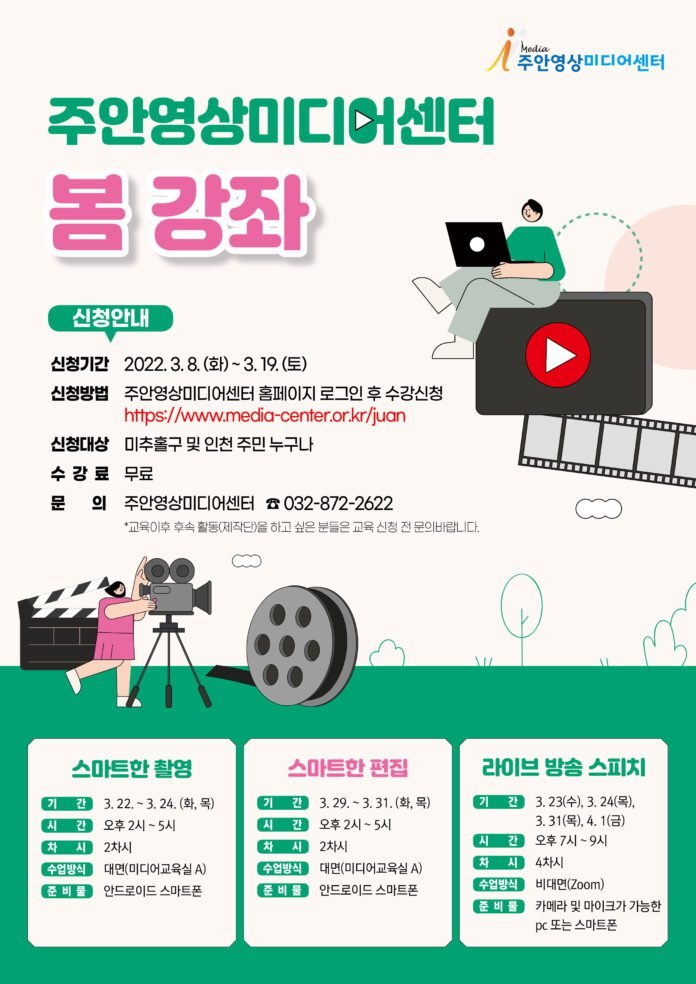 인천 미추홀구(구청장 김정식) 주안영상미디어센터는 22일부터 다음달 1일까지 봄 강좌 프로그램을 개강한다.