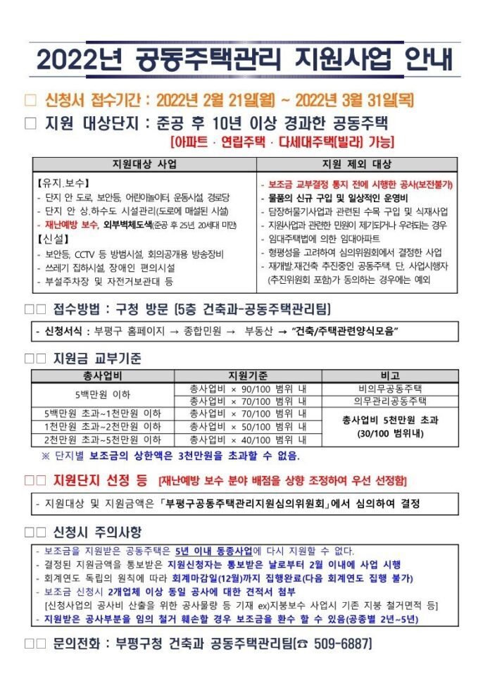 부평구, 2022년도 공동주택 관리 지원 사업 신청 접수