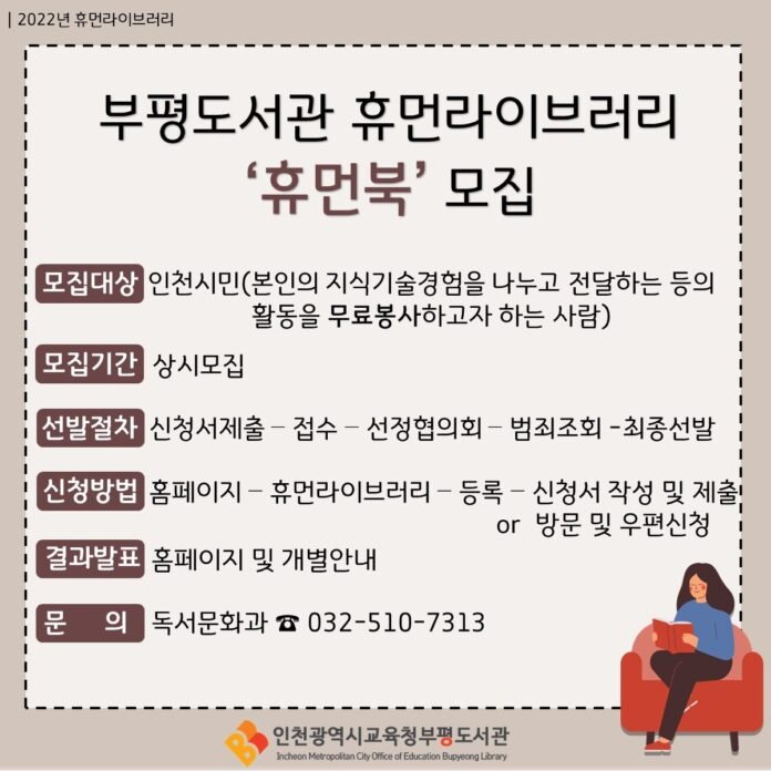 신청은 부평도서관 홈페이지에서 상시 가능하며 기타 자세한 사항은 부평도서관 독서문화과(☎032-510-7313)로 문의하거나, 홈페이지(lib.ice.go.kr/bupyeong)를 참고하면 된다.